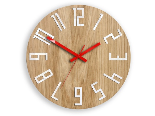 KWARCOWY ZEGAR ŚCIENNY - Dębowy Slim Biały ze wskazówkami w żywym czerwonym kolorze.