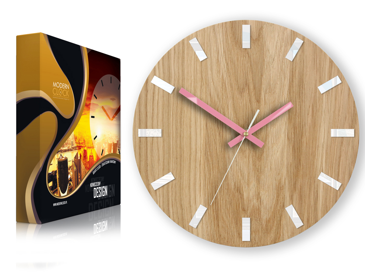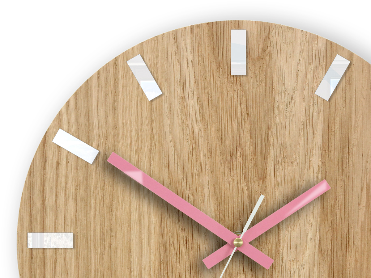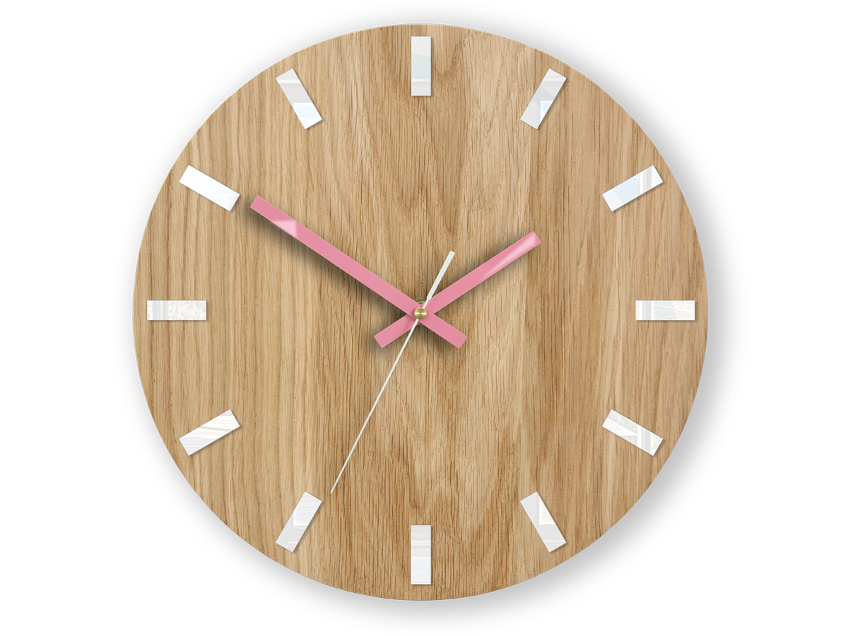 FABRYCZNIE NOWY i bardzo oryginalny zegar ścienny DĄB SIMPLE Z INDEKSAMI W KOLORZE BIAŁYM ORAZ RÓŻOWYMI WSKAZÓWKAMI
