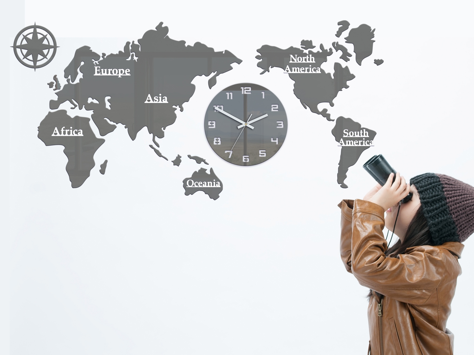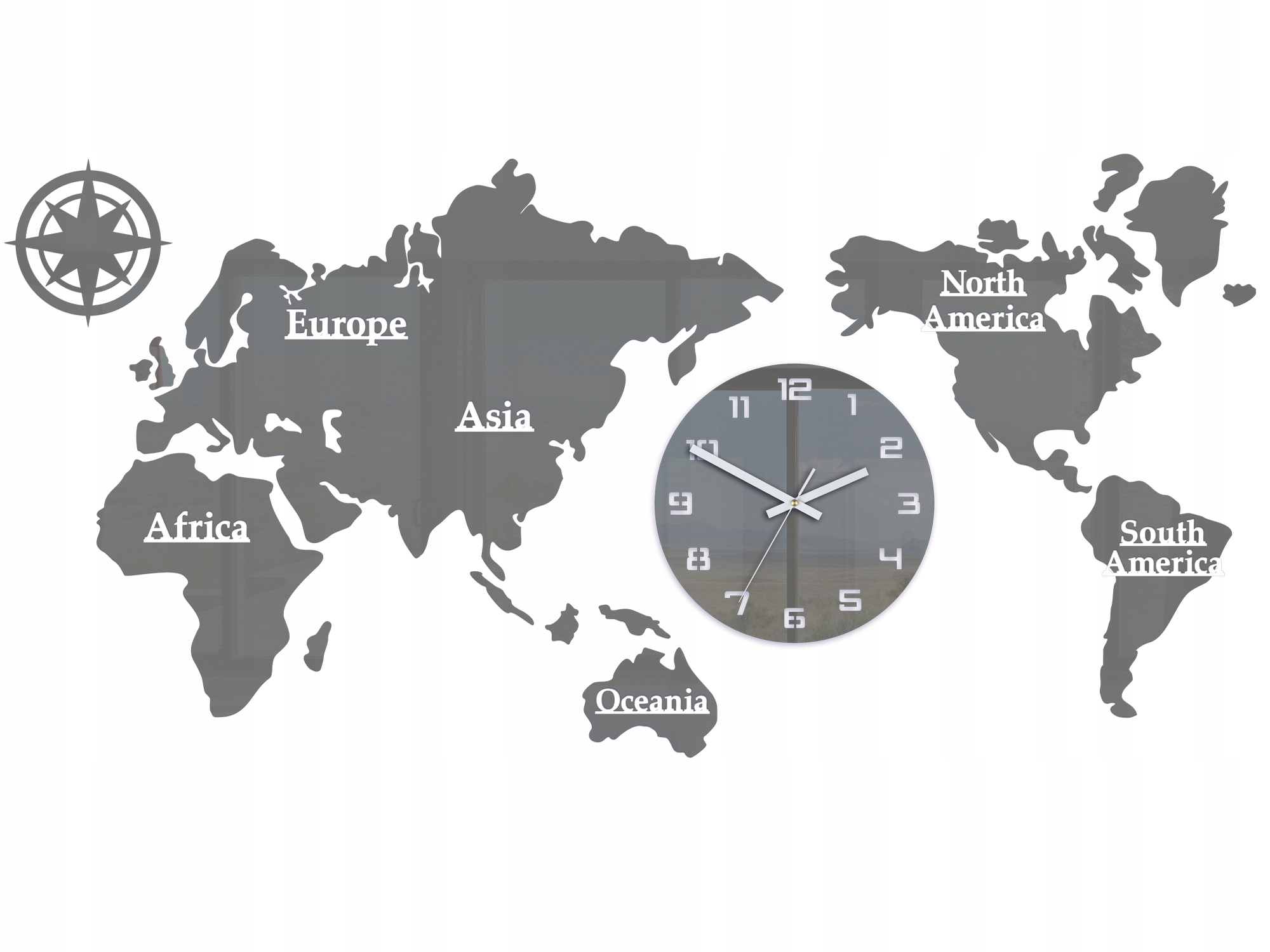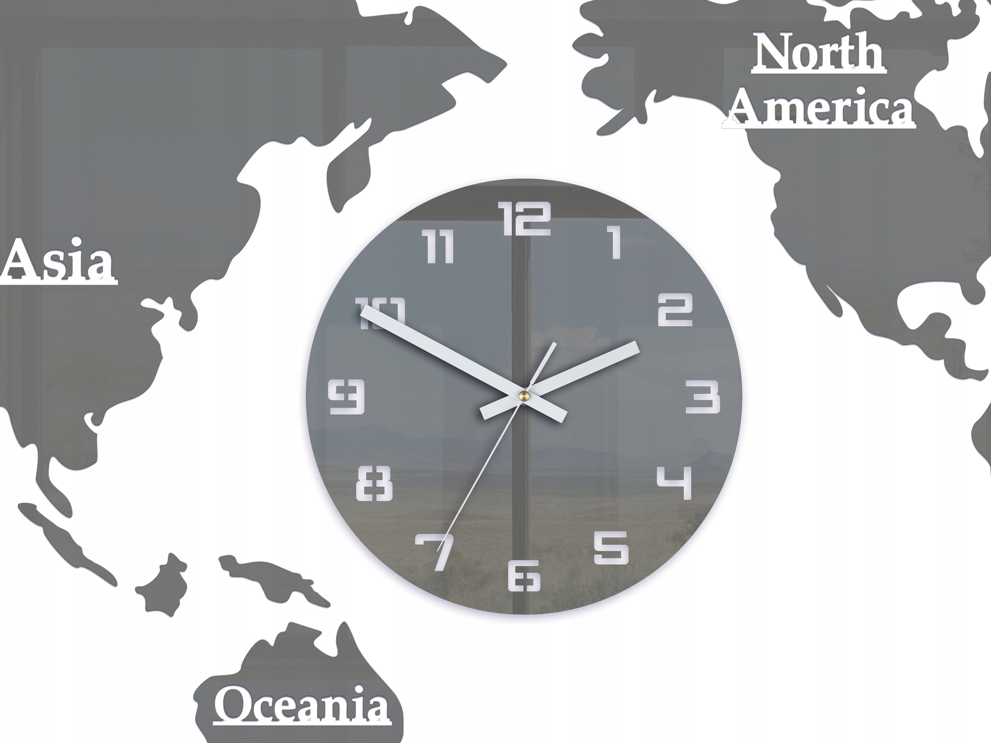Duży i zarazem elegancki zegar ścienny - ekspozycja składająca się z mapy świata i jednego dużego zegara, który wskazującego czas. Jego design oraz nowoczesny styl urzeka każdego kto na niego spojrzy. Kontynenty i jak i sam zegar wykonane są z szarego błyszczącego szkła akrylowego. Cała ekspozycja idealnie będzie komponować się w każdym wnętrzu. WORLD- MAPA ŚWIATA to nie tylko zegar ale piękna ozdoba Twojego salonu, pokoju, czy też biura.