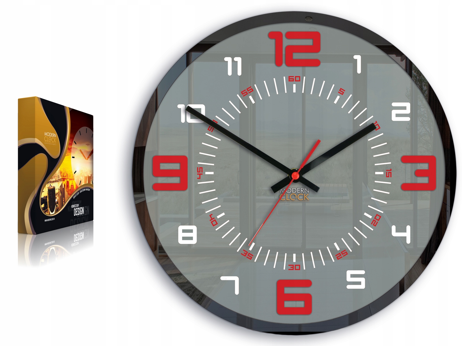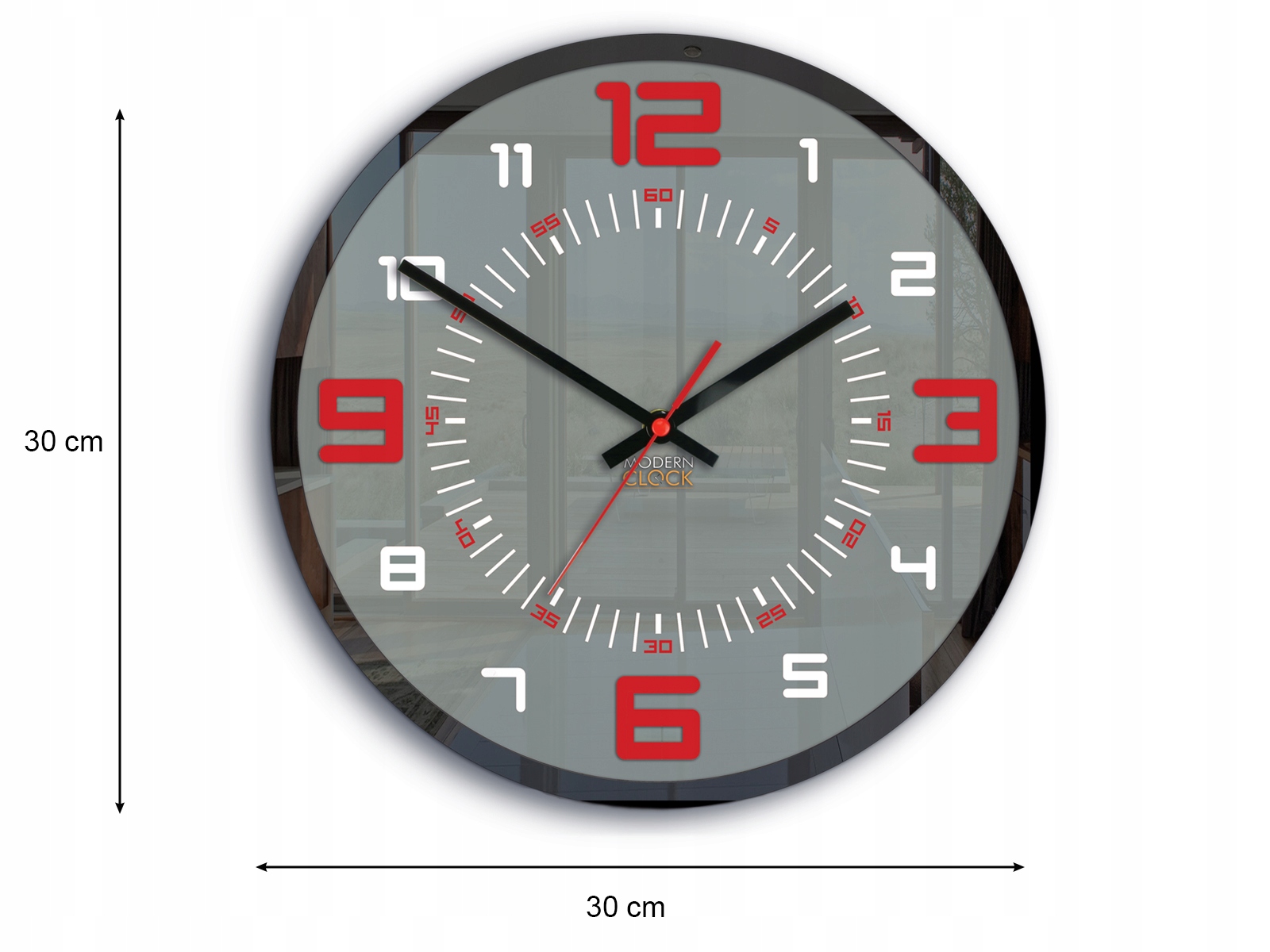 Zegar ten to połączenie szarej tarczy ze szkła akrylowego z trójwymiarowymi czerwono - białymi cyframi. Całość zegara została dopracowana ciekawą czarna oblamówką w wysokim połysku, co daje zegarowi trójwymiarowości. Nowoczesne połączenie kolorystyczne sprawi, że twój salon, pokój dzienny czy jadalnia będzie nieszablonowy, ekspresyjny i zyska niespotykany klimat. Jego design urzeknie każdego kto na niego spojrzy.