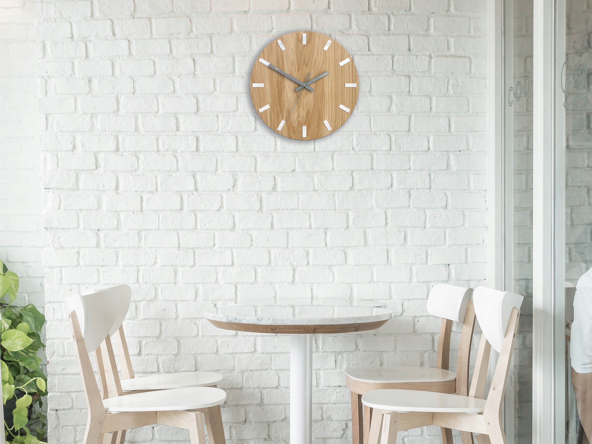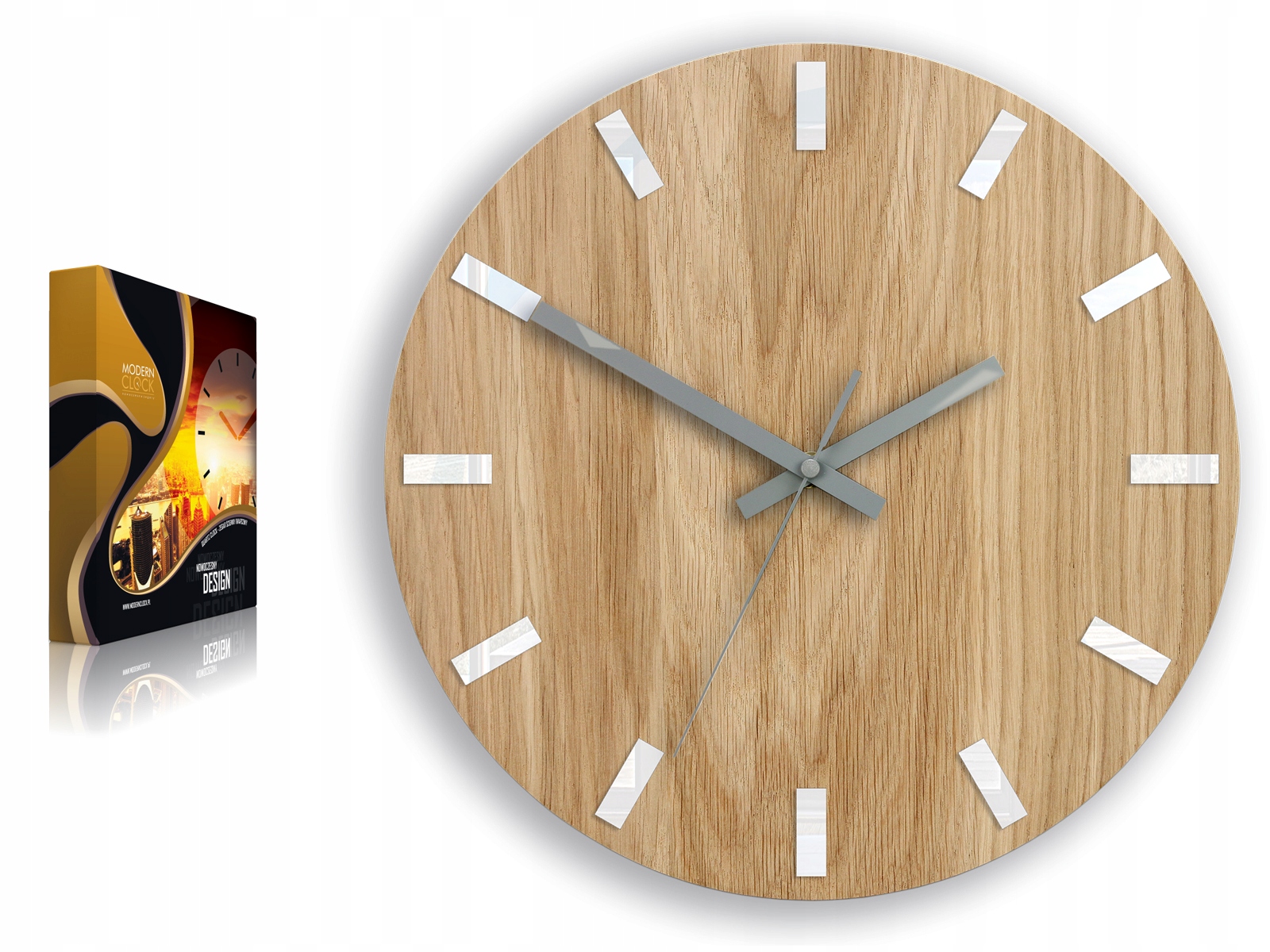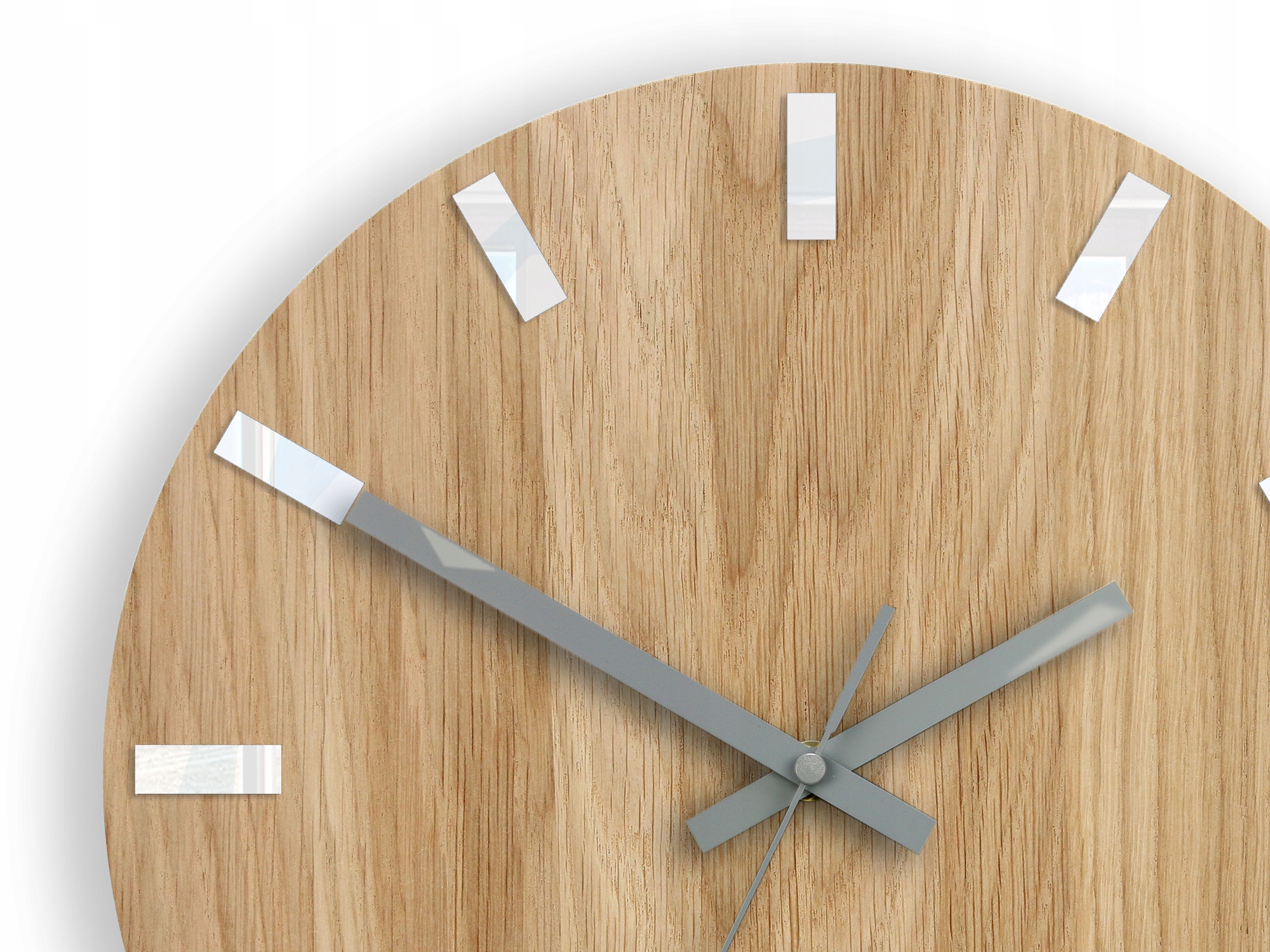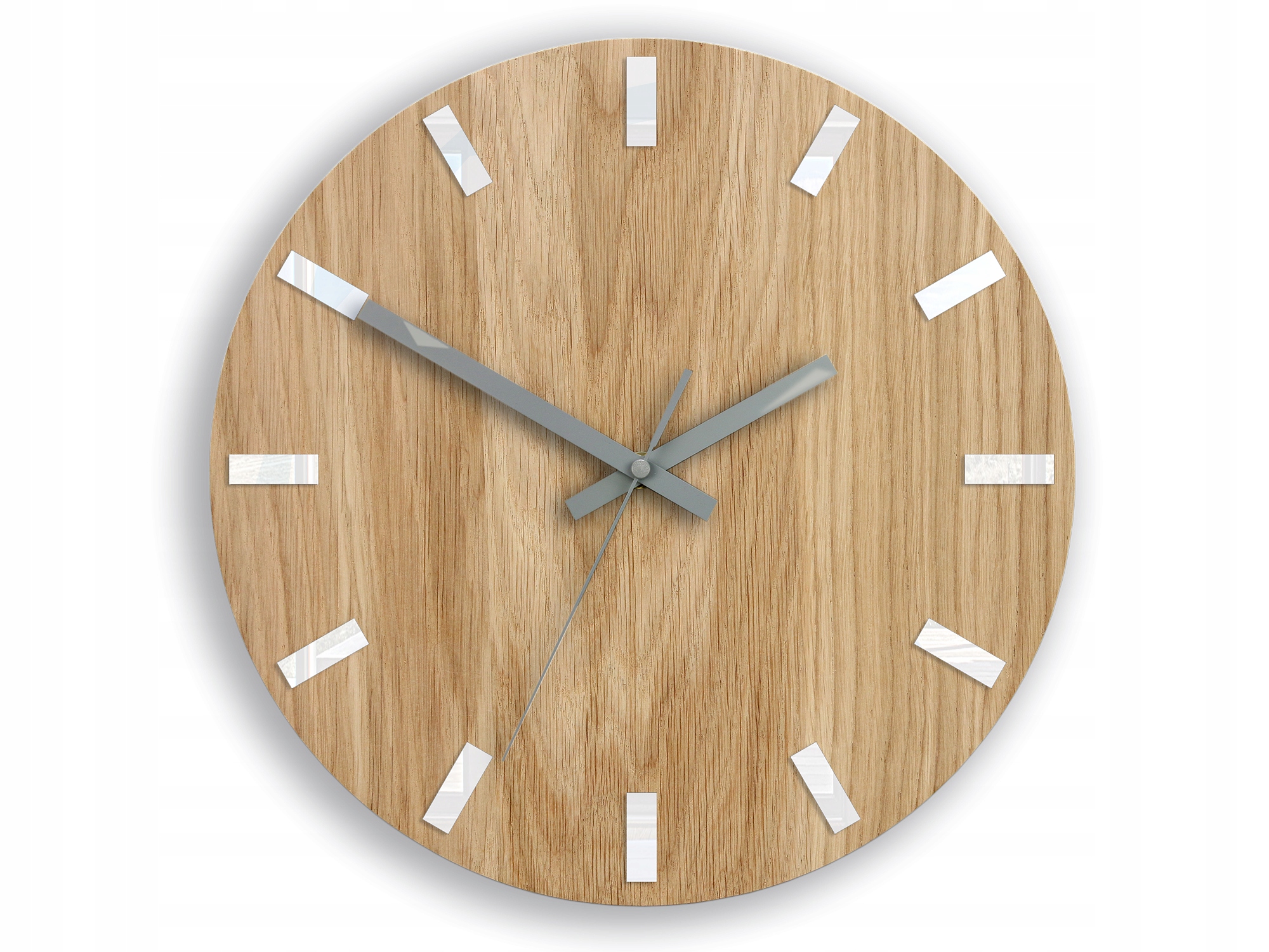 FABRYCZNIE NOWY i bardzo oryginalny zegar ścienny DĄB SIMPLE z indeksami w kolorze białym i szarymi wskazówkami.